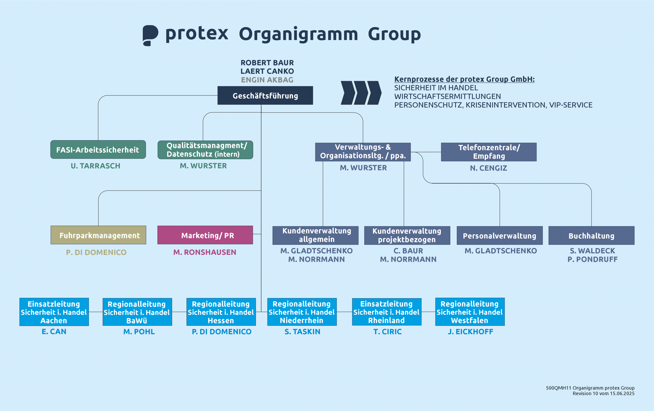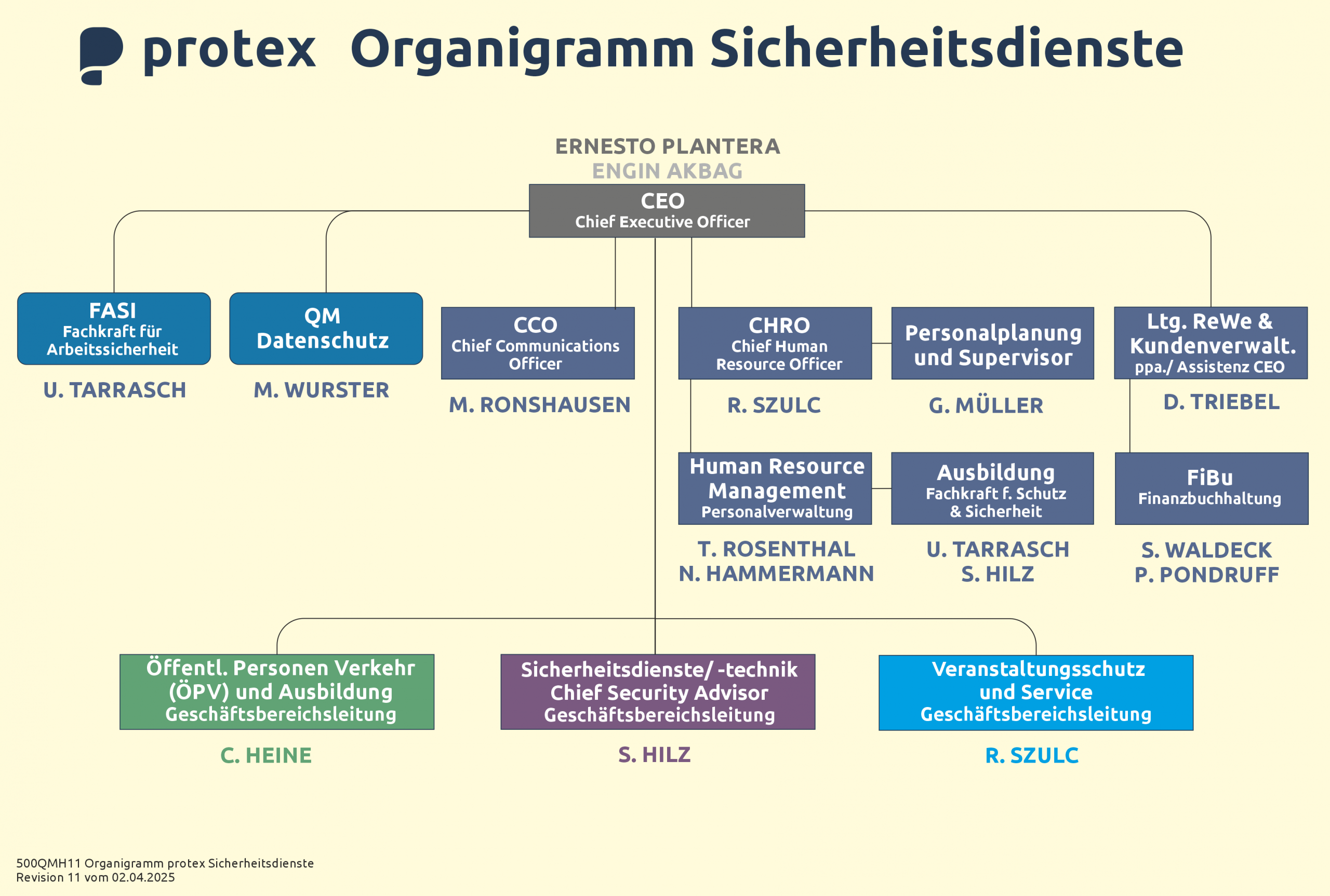 Bei protex sind Aufgabengebiete deutlich kommuniziert, strukturiert geplant und in der Führungsebene personell mit überwiegend sehr langjährigen Mitarbeitenden ideal besetzt. Die interne Kommunikation ist eine der wesentlichen Stärken unseres Unternehmens. Ein Mal wöchentlich findet im Rahmen eines Jourfix ein persönlicher Austausch der Führungskräfte zu aktuellen Projekten, Kundenanfragen und Allgemeinem statt. Hierzu nehmen immer ein Entscheidungsträger aus Geschäftsleitung, Personal- und Kundenverwaltung, Marketing, Vertrieb sowie die Geschäftsbereichsleiter aus Veranstaltungsschutz, ÖPV und Sicherheitsdienste/-technik teil. Rückfragen zu ganz unterschiedlichen Vorgängen werden unmittelbar persönlich besprochen und aufgrund flacher Organisation sofort beantwortet/ Problemlösungen gemeinsam erarbeitet. Im Nachgang erfolgt ein Protokollversand an die leitenden Mitarbeitenden, so dass der interne Austausch zu allen laufenden Aufträgen und Projekten kontinuierlich gewährleistet ist.